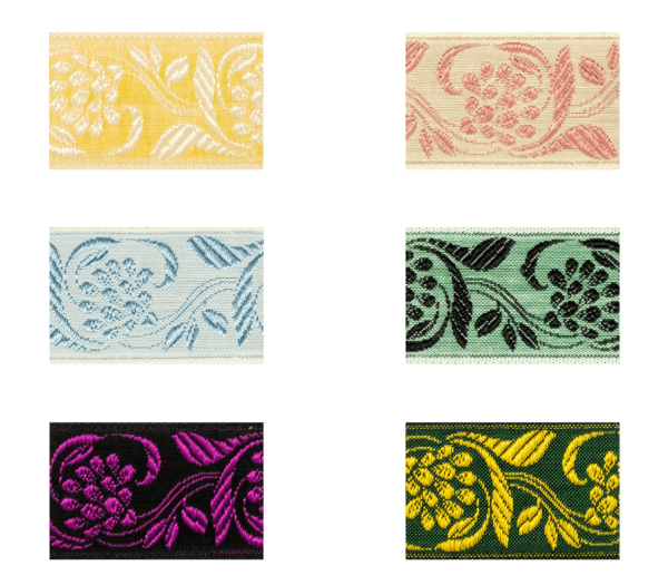 High-quality jacquard braid with a floral design, made in Austria. Use the colourful woven ribbons to decorate traditional costume fashion, children's clothing, bags, cushions and many other handmade products.